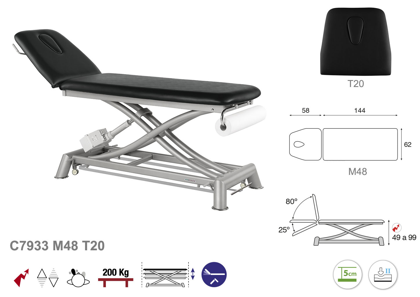 Camilla eléctrica de dos cuerpos con respaldo en negativo, elevación en tijera y accionamiento periférico (desde cualquier parte de la camilla con el pie.)